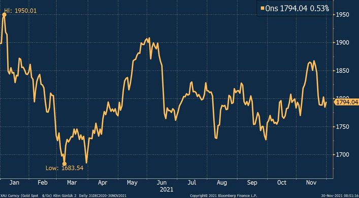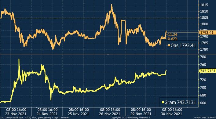 Ons altın, geçen haftaya 1.850 dolar civarında başladıktan sonra hızlı bir şekilde 1.800 doların altına gerilemiş ve cuma gününe kadar bu seviyelerde yatay bir seyir izlemişti. Cuma günü yeni koronavirüs varyantı omicronun piyasalarda yarattığı endişelerle 1.815 dolara kadar tırmanan ons altın, salı günü varyant endişelerinin yeniden artmasıyla 1.793 dolar civarında işlem görüyor.