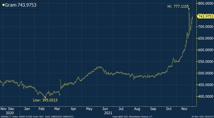 Geçen hafta dolar/TL’deki yükselişle 777 TL’ye kadar yükselerek rekor kıran gram altın, haftanın ikinci yarısında kurdaki gerilemeyle beraber 720 TL’nin altına düşmüştü. Gram altın, küresel altın fiyatları ve dolar/TL’deki yatay seyirle haftaya 713 TL seviyesinde başladıktan sonra dolar kurundaki yükselişle 743 TL civarında bulunuyor.