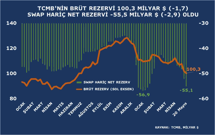 Türkiye Cumhuriyet Merkez Bankası (TCMB) rezervlerinde düşüş ivmesi 20 Mayıs haftasında da devam etti.