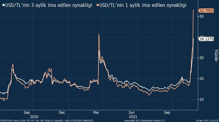 Dolar/TL'de 1 aylık ima edilen oynaklık ise yüzde 50 seviyesinin üzerinde bulunuyor.