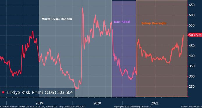 Türkiye’nin kredi temerrüt risk primi (CDS) cuma günü 1 yılın ardından yeniden 500 baz puan seviyesinin üzerine çıkarken 10 yıllık tahvil faizi yüzde 21,12 seviyesinde bulunuyor.